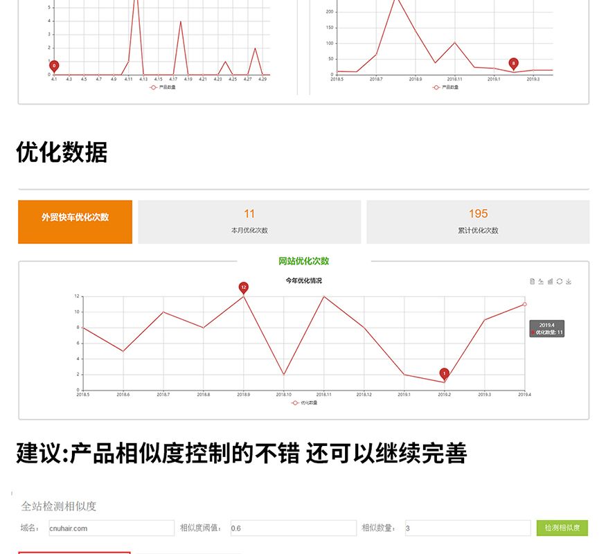 客戶公司于2014年創(chuàng)立于中國(guó)青島,是行業(yè)內(nèi)發(fā)制品供應(yīng)商,致力于高端假發(fā)、睫毛的出口貿(mào)易。谷歌seo推廣效果怎么樣?我們的Google優(yōu)化推廣假發(fā)睫毛行業(yè)案例客戶于2017年選擇外貿(mào)快車產(chǎn)品,初次簽訂了1年合作協(xié)議,2018年到期以后選擇了一次性續(xù)費(fèi)3年。目前外貿(mào)快車網(wǎng)站上共發(fā)布了1341個(gè)產(chǎn)品,并且客戶很注重產(chǎn)品文案的質(zhì)量,不相似產(chǎn)品的比例高達(dá)80%以上。產(chǎn)品新聞和行業(yè)知識(shí)也持續(xù)在更新中,目前網(wǎng)站上已發(fā)布111條新聞和113條行業(yè)知識(shí)。這些頁(yè)面共計(jì)為客戶帶來(lái)2258條詢盤,日均流量更是高達(dá)264個(gè)。