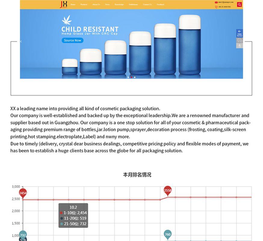 深圳網絡推廣公司-思億歐服務中心的Google優化案例客戶是提供各種化妝品包裝解決方案的品牌企業。公司以卓越的領導為后盾,是一家知名的制造商和供應商,總部設在廣州。我們公司是您所有化妝品和藥品包裝的一站式解決方案,提供優質的瓶子、洗液泵、噴嘴器、裝飾工藝(結霜、涂層、絲網印刷、燙印、電鍍、標簽)和更多其他服務。